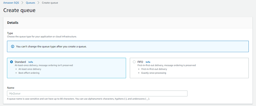 The first thing we need to do is head on over to the AWS console, login and then search for SQS in the list of services. Once we are in the Amazon SQS portion of the console we need to click the, “Create queue” button. To create our queue, we need to: