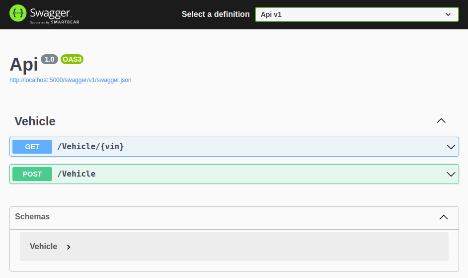 In your favorite browser, navigate to: http://localhost:5000/swagger/index.html. You should see the following UI.
