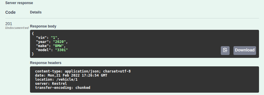 Once the request has finished, Swagger UI should update with a 201 response.