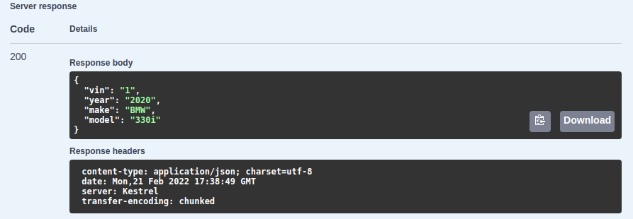 Great! We now have data in our local DynamoDB database. Let’s try to fetch the data we just created. Let’s scroll up and click the “GET” button and then again, the “Try it out” button. In the “vin” parameter input box, enter “1”, the value that we just used for the vin in our POST request and then click the “Execute” button. Swagger UI should update with the data that we just created.