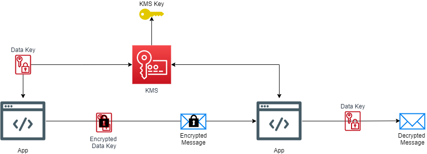 In this tutorial, we’ll go over a frequently used strategy utilizing AWS KMS for key management, utilizing symmetric keys for data encryption. In this strategy, KMS Keys are stored in AWS. These Keys, are used to generate “data” keys. We will then encrypt our data with the data key and then send our encrypted data across the wire along side the encrypted data key. On the other end of the wire we will use the same AWS Key to decrypt the data key and then decrypt the payload with the decrypted data key.